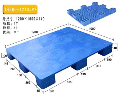 產(chǎn)品型號: HD-1210JP2 產(chǎn)品貨號: T42 產(chǎn)品外尺寸: 1200×1000×140 產(chǎn)品內尺寸: 產(chǎn)品結構: 九腳平板 產(chǎn)品內容量(L): 承重量(T): 動(dòng)載:1T 靜載:4T 貨架:X 產(chǎn)品認可標準: 此款塑料托盤(pán)適用平地墊倉使用,防潮效果好,且易于清洗;