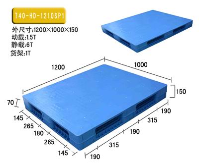 產(chǎn)品型號: AT-1210SP1 產(chǎn)品貨號: T40 產(chǎn)品外尺寸: 1200×1000×150 產(chǎn)品內尺寸: 產(chǎn)品結構: 雙面平板 產(chǎn)品內容量(L): 承重量(T): 動(dòng)載:1.5T 靜載:6T 貨架:1T 產(chǎn)品認可標準: ISO9001:2000質(zhì)量體系認證 此款塑料托盤(pán)為雙面平板面重型;