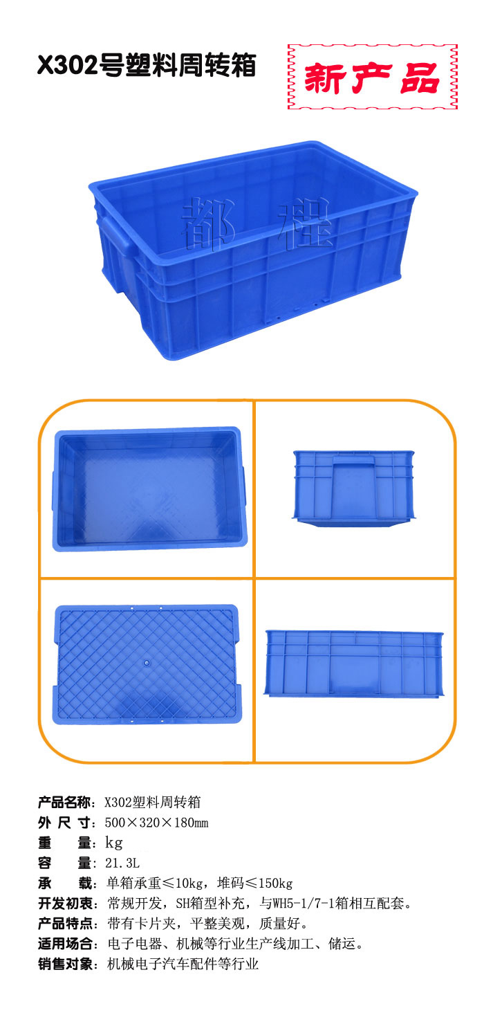 編號: X302 外尺寸(mm): 500*320*180 內尺寸(mm): 473*292*170 內容積(L): 21.3 備注: SH箱型補充開(kāi)發(fā),與WH5-1/7-1箱相互配套,帶有卡片夾,平整美觀(guān),適用于電子電器、機械等行業(yè)產(chǎn)線(xiàn)加工、儲運。